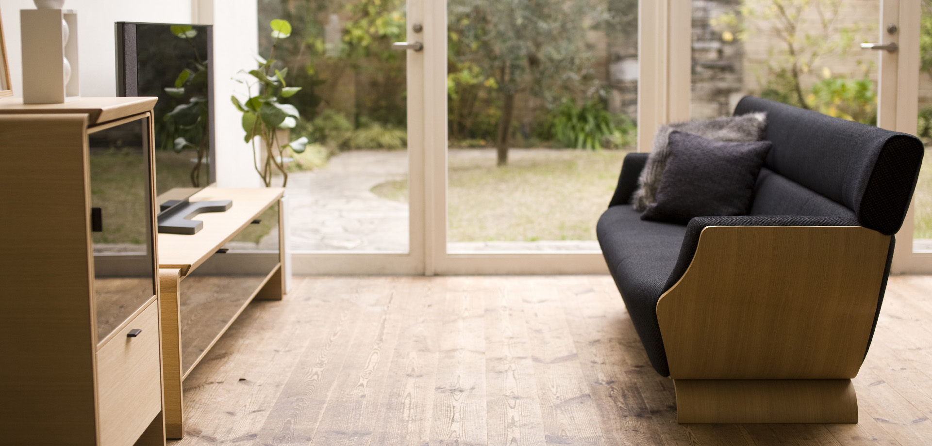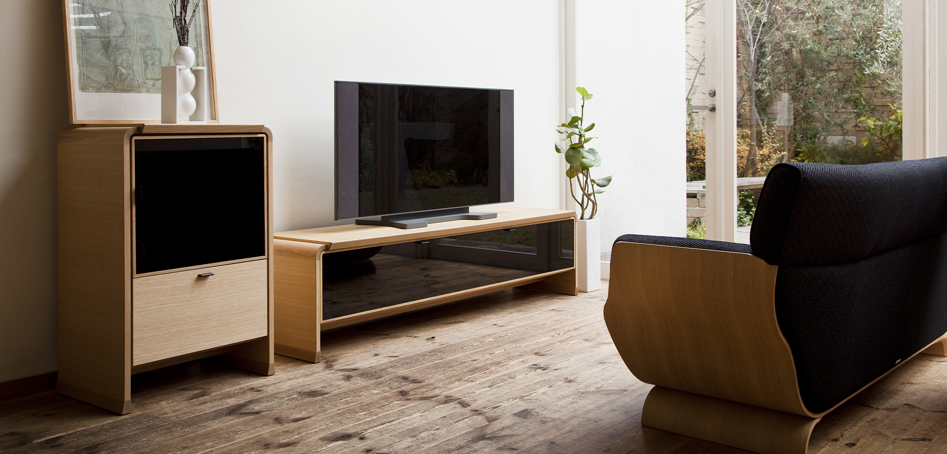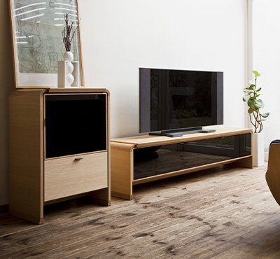 シンプルだけど、どこか都会的。オーディオボードの角に丸みをつけることで、親しみやすさを感じさせます。TVボードには収まらないAV機器を収納でき、スモークガラスのため赤外線のリモコン操作が可能です。