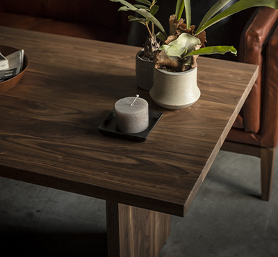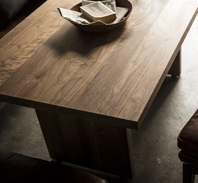 日々の暮らしで起こる様々な出来事に、生まれる数多の感情。それらを常に支えられる大樹であってほしい、そんな願いを込めてデザインされました。しっかりとした厚みのある無垢材の天板は、木そのものの豊かな表情をお楽しみいただけます。厳選された素材から放たれる濃厚なオーラを存分に感じてもらえるよう、装飾は一切ありません。脚間は3 段階に調節可能で、家庭に合わせて脚の配置を変えられます。
