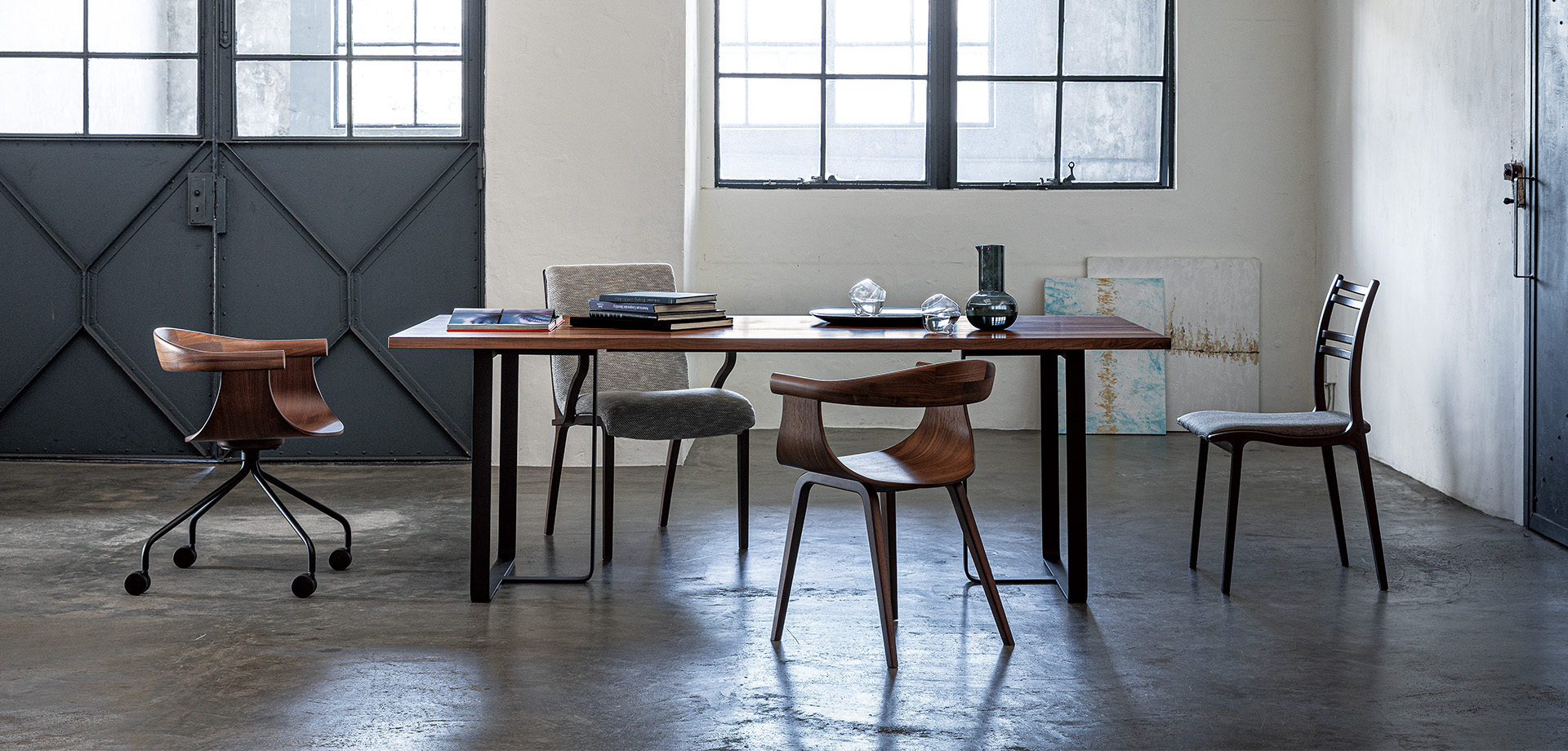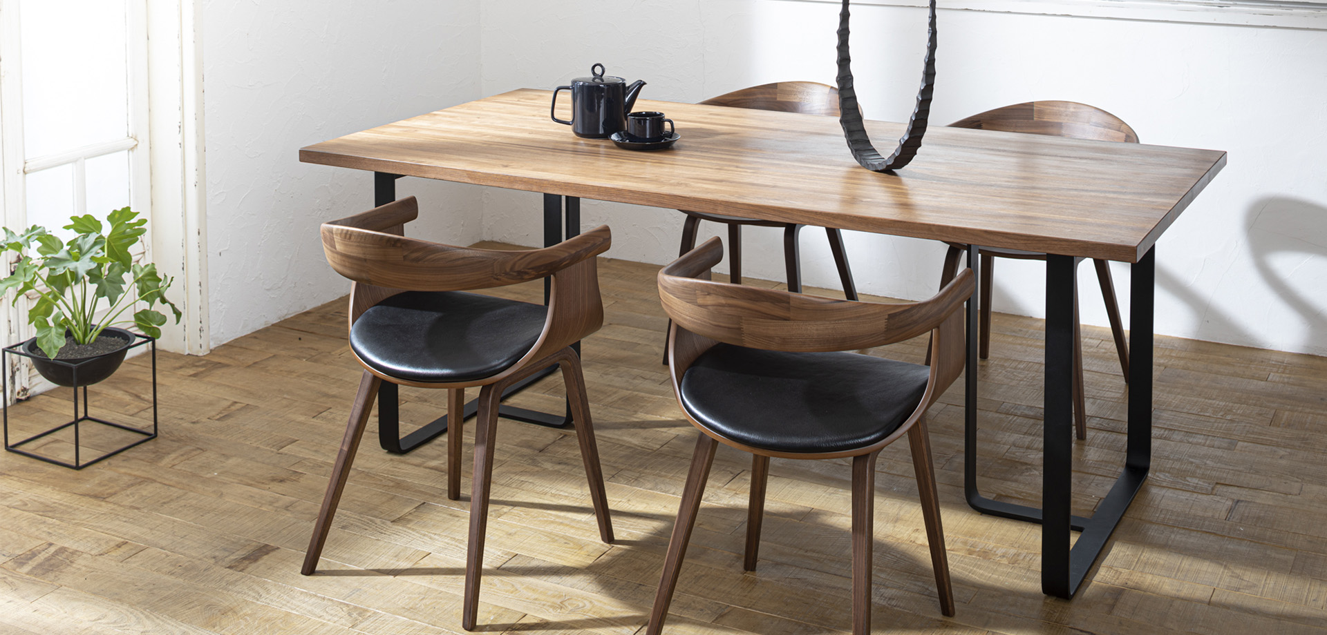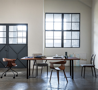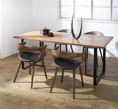 2種類の天板と8種類の面形状から選べるオーダーテーブル。スチール脚と無垢材の天板という異素材のミックスは、心地よく共鳴して洗練されたダイニング空間へと導きます。
