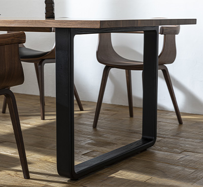 2種類の天板と8種類の面形状から選べるオーダーテーブル。無垢材からなる天板と脚は、木材の温かみを存分に感じさせます。特別仕様として脚を黒色にすることも可能です。