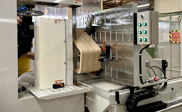 Machine that cuts molded plywood to a specified width by numerical control