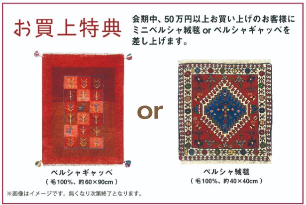 期間中、50万円以上お買い上げのお客様には、ミニペルシャ絨毯またはペルシャギャッベをプレゼント。