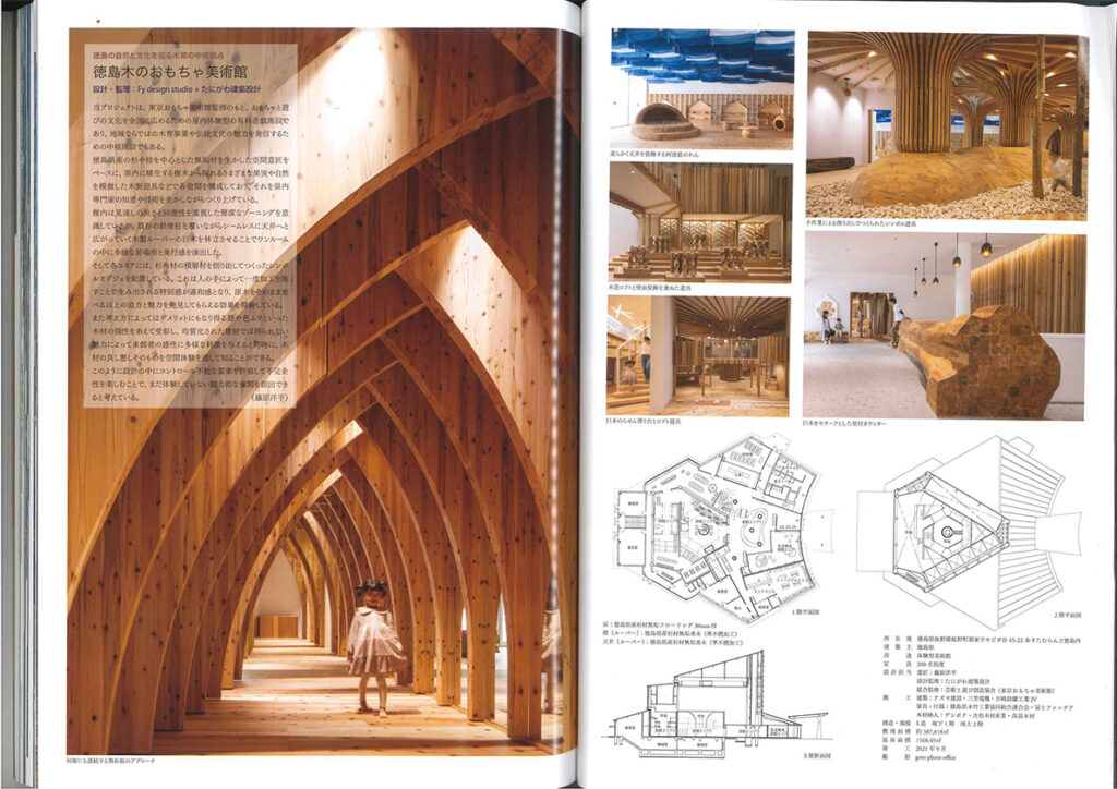誌面では、**「徳島木のおもちゃ美術館」**をテーマに、館内の象徴的なアーチ構造や木質空間のデザインが紹介されています。誌面(P.◯)では、大規模木架構がつくり出す伸びやかな空間や、地域材を生かした展示什器の様子などが美しい写真とともに掲載されています。