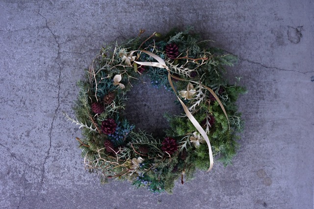 香り豊かな針葉樹をたっぷりと使ったグリーンベースに、赤とゴールドの実を添えた、落ち着いた雰囲気の大人のクリスマスリースを制作します。