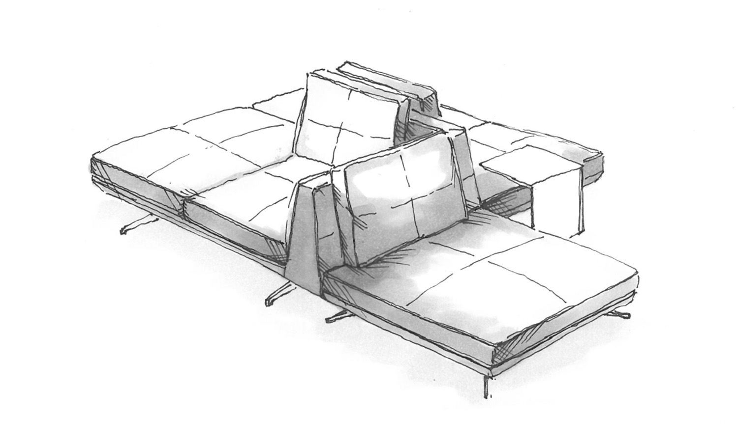 モジュールソファとしての機能性に特化し、デザインを構築しています。連結によって自由なレイアウトが可能となり、空間や用途に合わせて多彩な表情を生み出します。今回の展示では、コーナーモジュールと1シーター背無しタイプを組み合わせ、複数のレイアウトバリエーションを体感いただける構成としました。