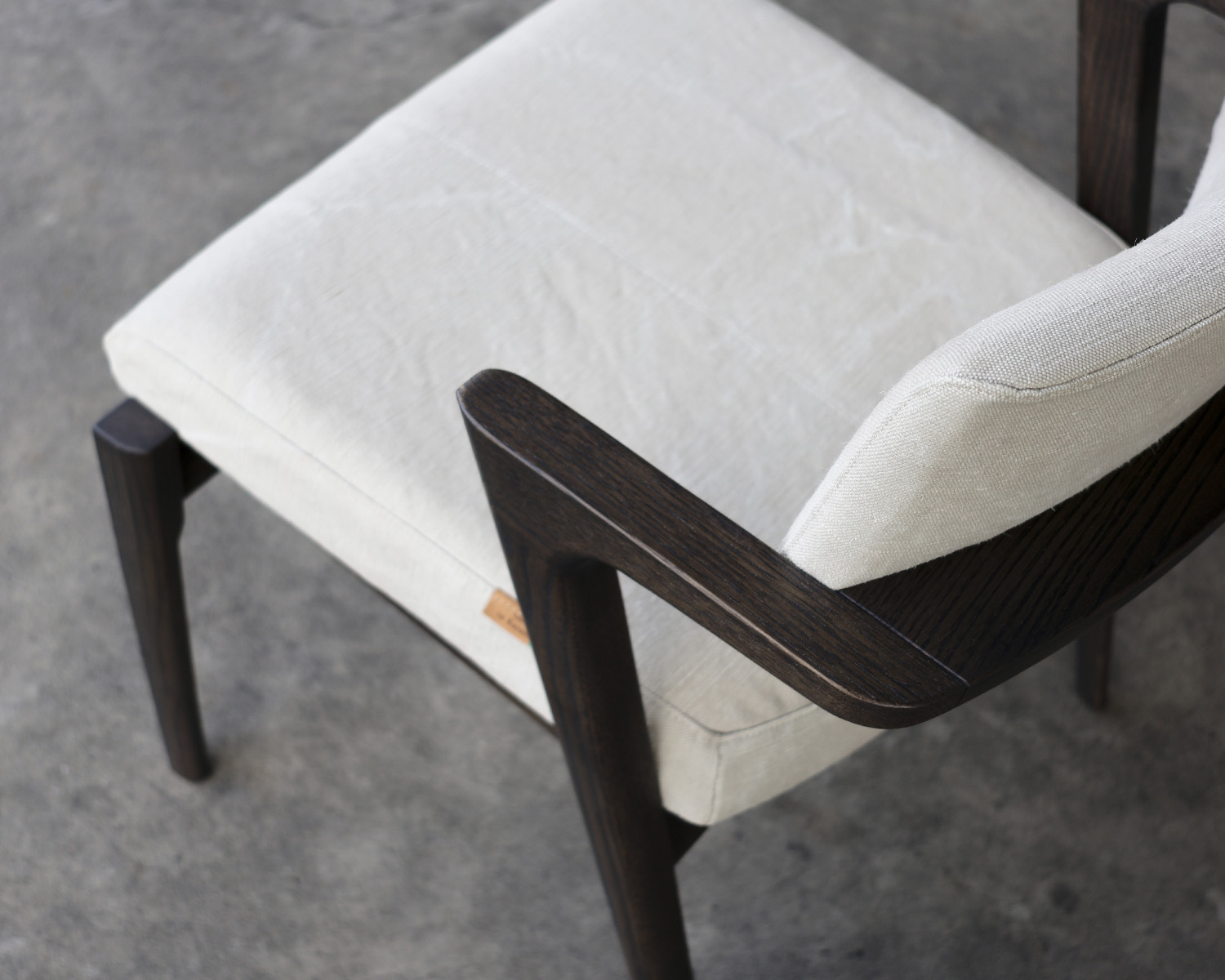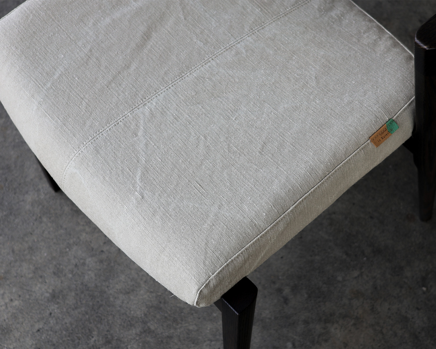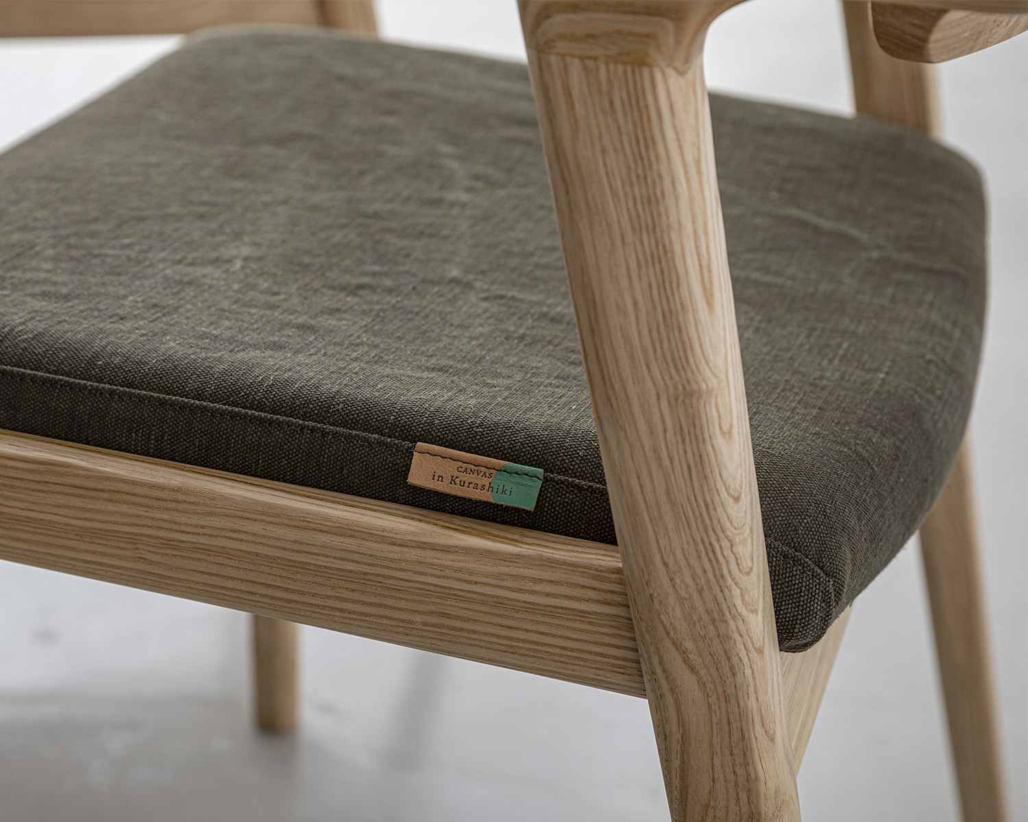 織りの町・倉敷で丁寧に織り上げられた、高密度の帆布。張りのある質感と、綿本来の豊かな風合いが特徴です。深みのあるカーキは、クリ材のあたたかな色合いと美しく調和し、空間に落ち着きと品格を添えます。